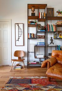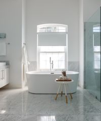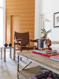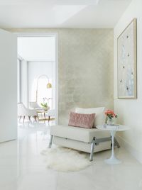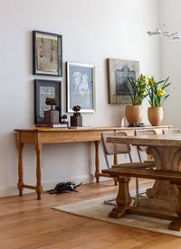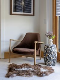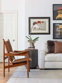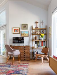 Crisp white walls, new wood flooring, and a reconfigured kitchen bring a sense of openness and ease, while an expanded master bath with a skylight and glass details adds modern comfort. A restrained palette allows the couple’s eclectic travel collection to take center stage, celebrating their stories through design.