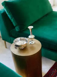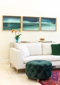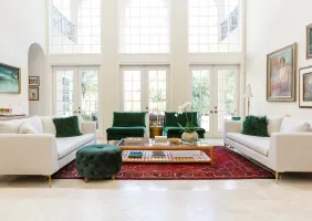 Emerald green furnishings, layered in varying textures and proportions, bring depth and balance to the room, while an oversized coffee table in natural leather and wood serves as a striking focal point. A traditional-style rug, paired with family artwork, ties the space together—blending sophistication with a sense of warmth and personality.