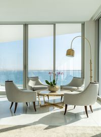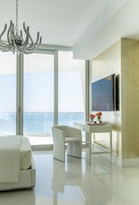 Leather sofas, velvet chairs, and marble tables set a modern foundation, while bold accents bring energy and personality. Designed to frame the ocean views, the living room blends luxury with ease. In the master suite, a palette of white leather, linen, and fur creates an airy, serene atmosphere, while the powder room stuns with a custom-lit onyx sink and floral wallpaper.